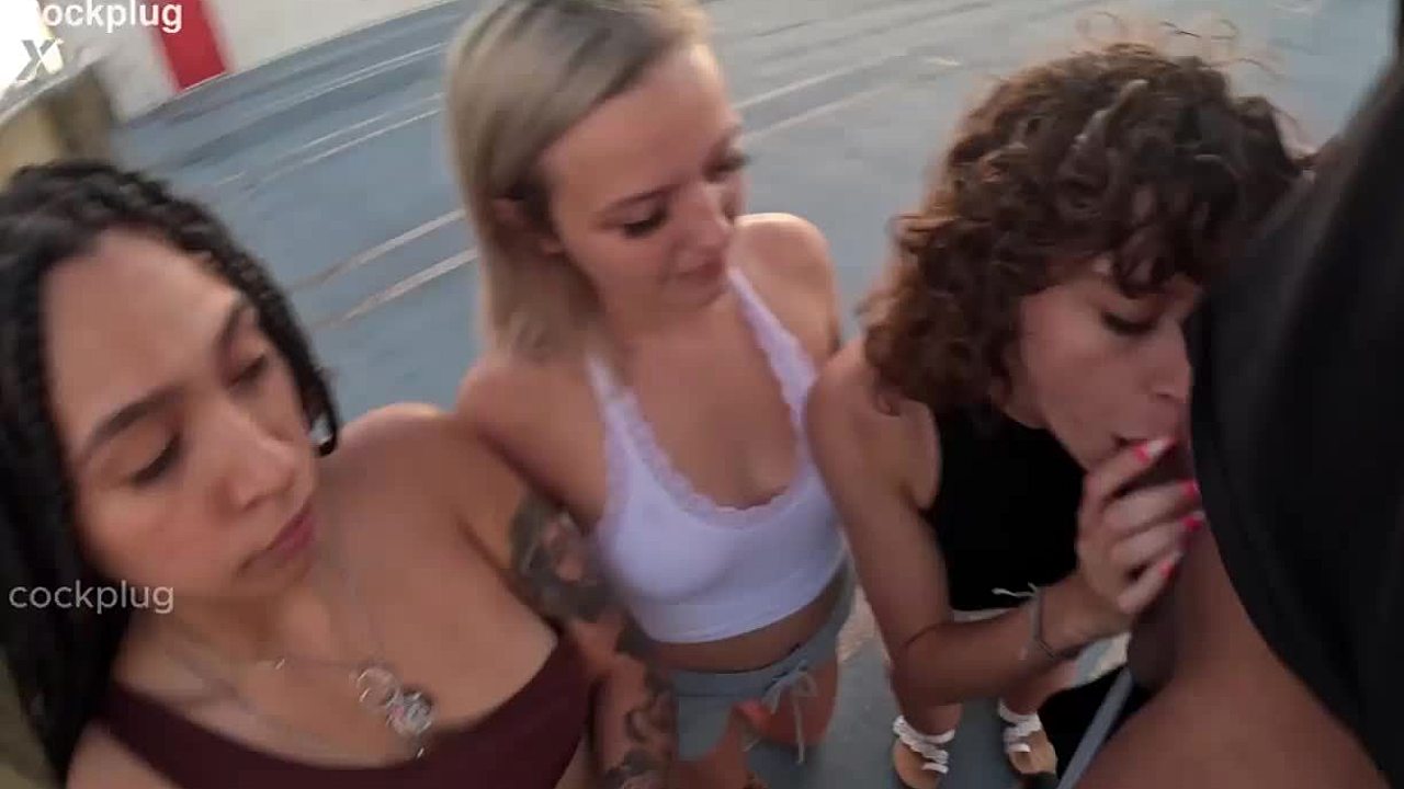 Rooftop Blowjob With Lover In 3 Some, Choking And Gagging Sloppily.