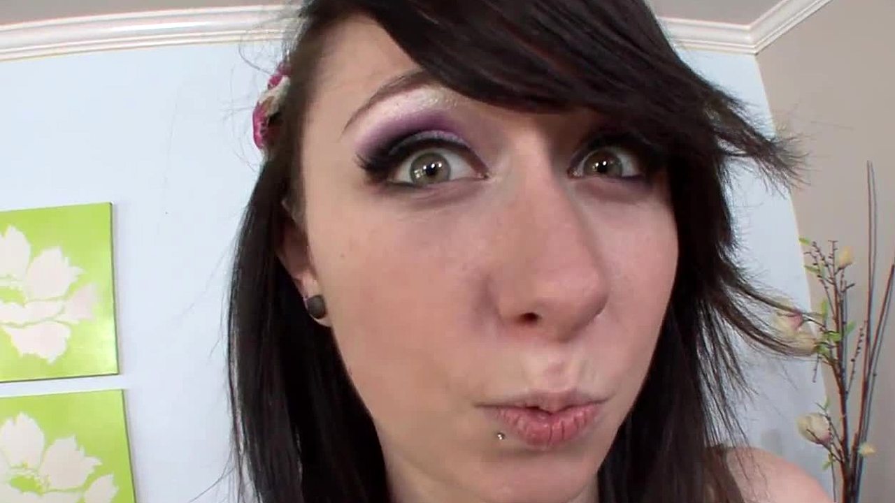 Slutty brunette's shaved pussy gets pounded by a big white dick with blowjob and creampie.