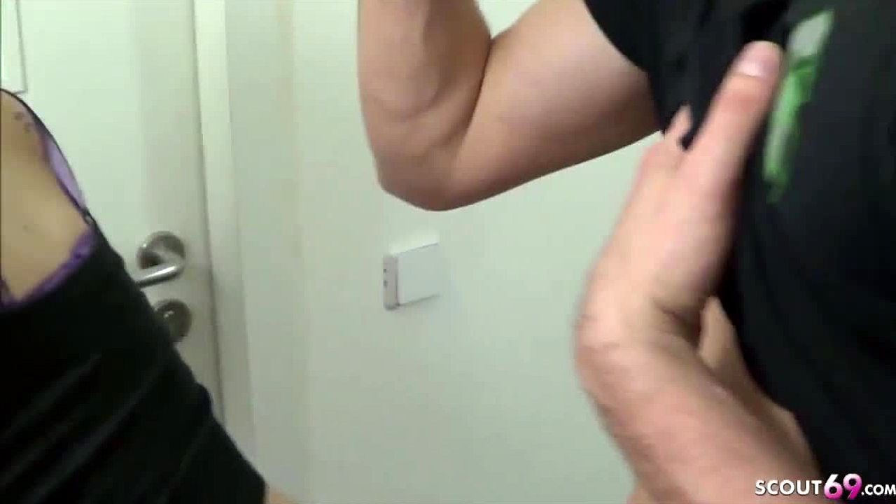 German teen 18+ gets blowjob and cum in stairwell threesome 😈