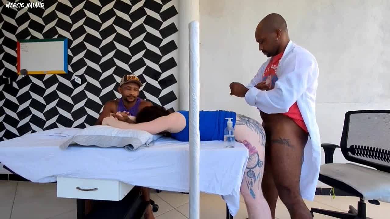 Doctor blows cum in patient's ass next to husband during interracial creampie