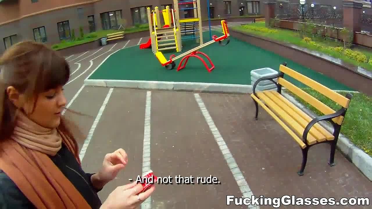 Fucking glasses not shy to bang this teen with shaved pussy on stairway