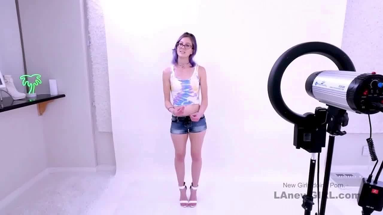 Purple-hair model gets intense fucking during her sofa casting interview with cum swallow finish
