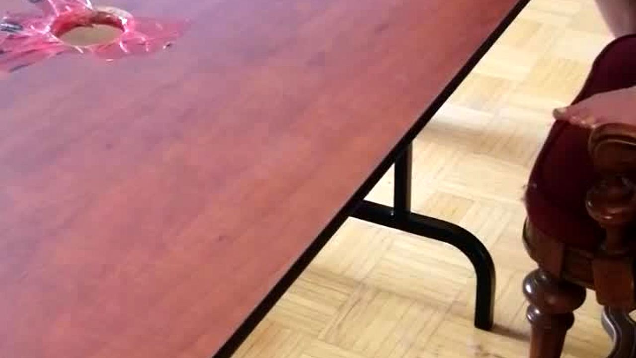 Hey, watch this femdom slave get his big cock stomped barefoot under the desk until cum explodes in cfnm footjob domination