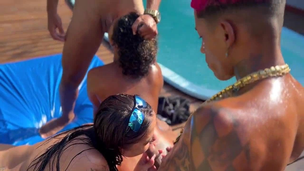 We have two studs and two sluts turning the pool into an orgy with big tits riding and doggystyle banging