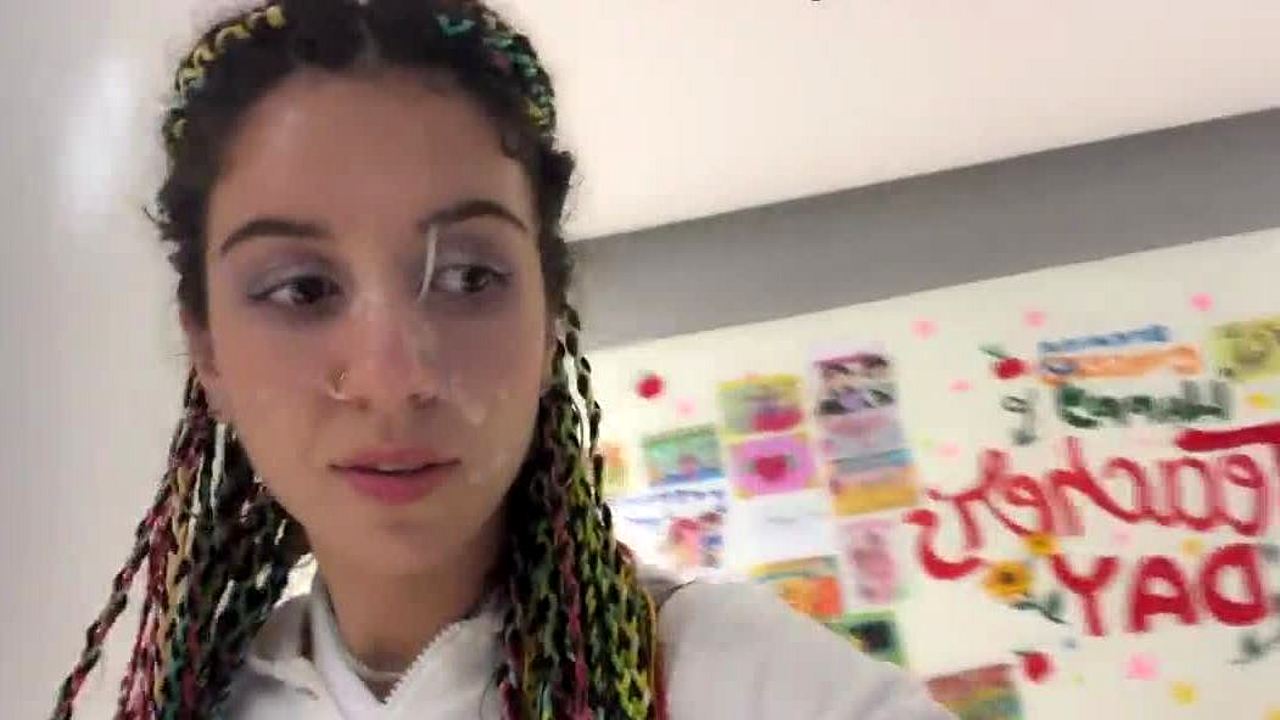 The cute teen gave a huge pov blowjob with facial cumshot in public toilet during crazy cumwalk at shopping mall.