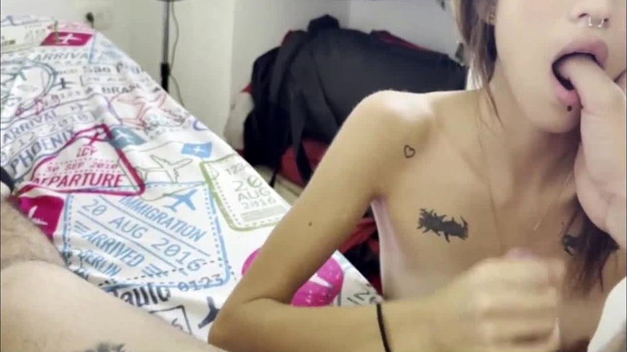 College stepsister with big tits and ebony skin gives interracial blowjob while alone at home in lingerie. She spits during domination workout in cage.