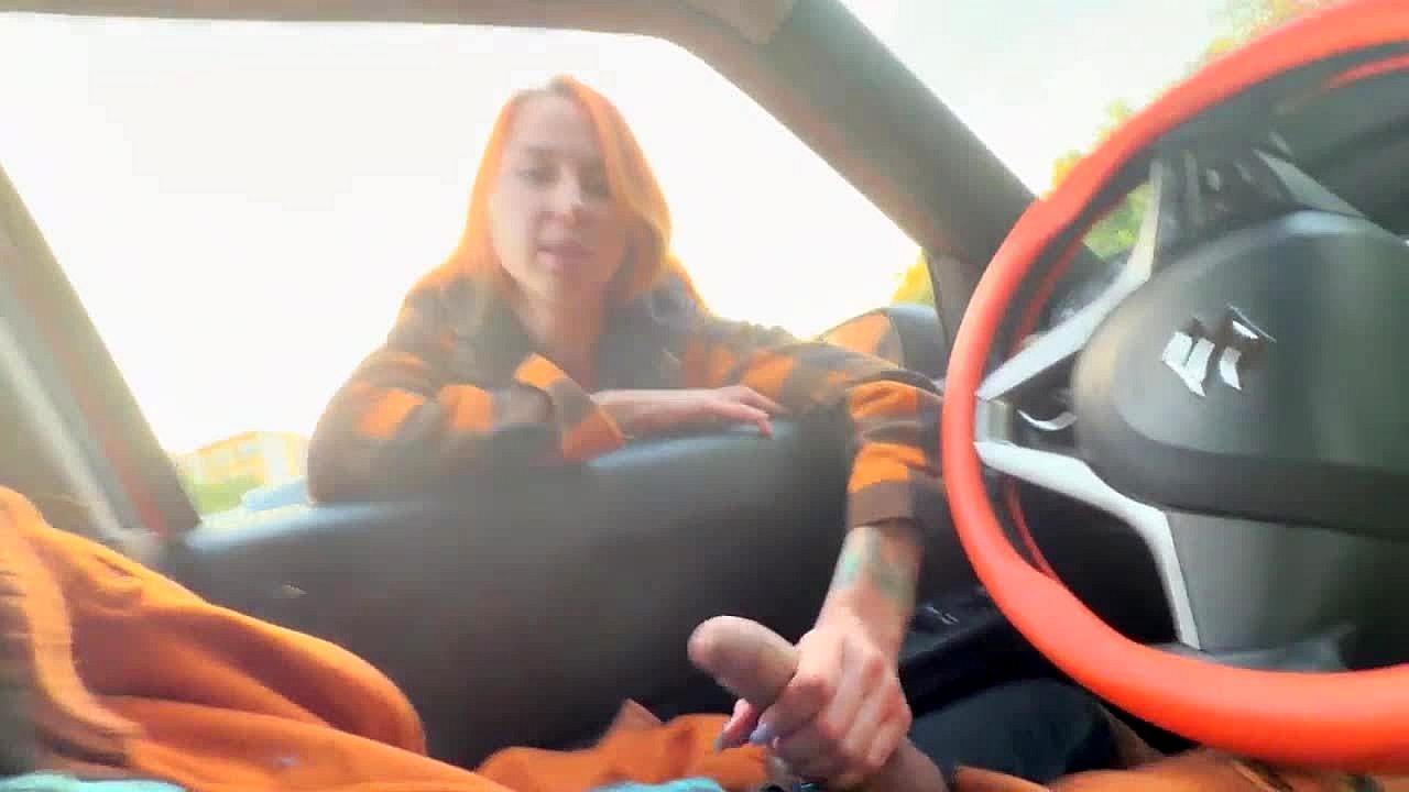 I flashed my dick in the car and this stranger girl caught me jerking off, showing her big tits to help with public blowjob