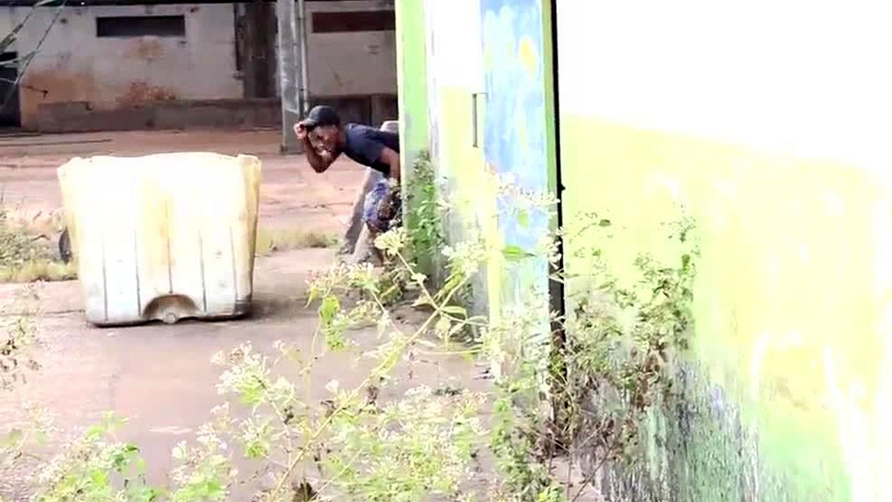 Enjoying neighbor in abandoned garage by masturbating her pussy with dildo surprise