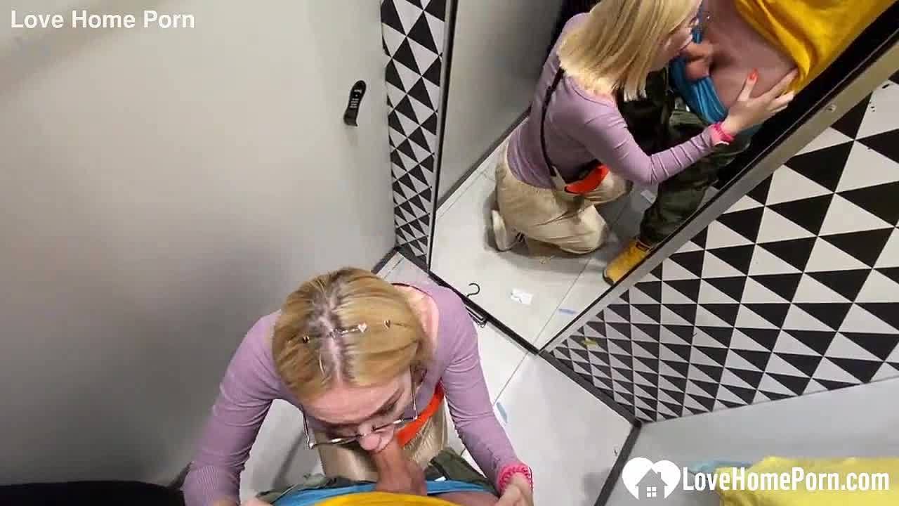 Will this blonde girlfriend with glasses and lipstick really suck cock and swallow cum in the changing booth?