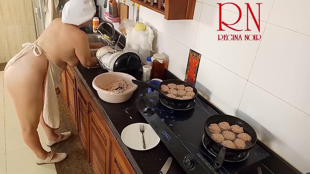 Nudist housewife Regina Noir naked cooking kitchen maid big pussy lips voyeur?